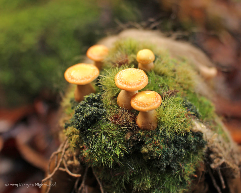 His back has been adorned with faux grass and my hand sculpted mushrooms. In his hands, he holds a small patch of grass with one lonely mushroom. The grass patch with the mushroom is not attached to the troll and can be removed from his hands.